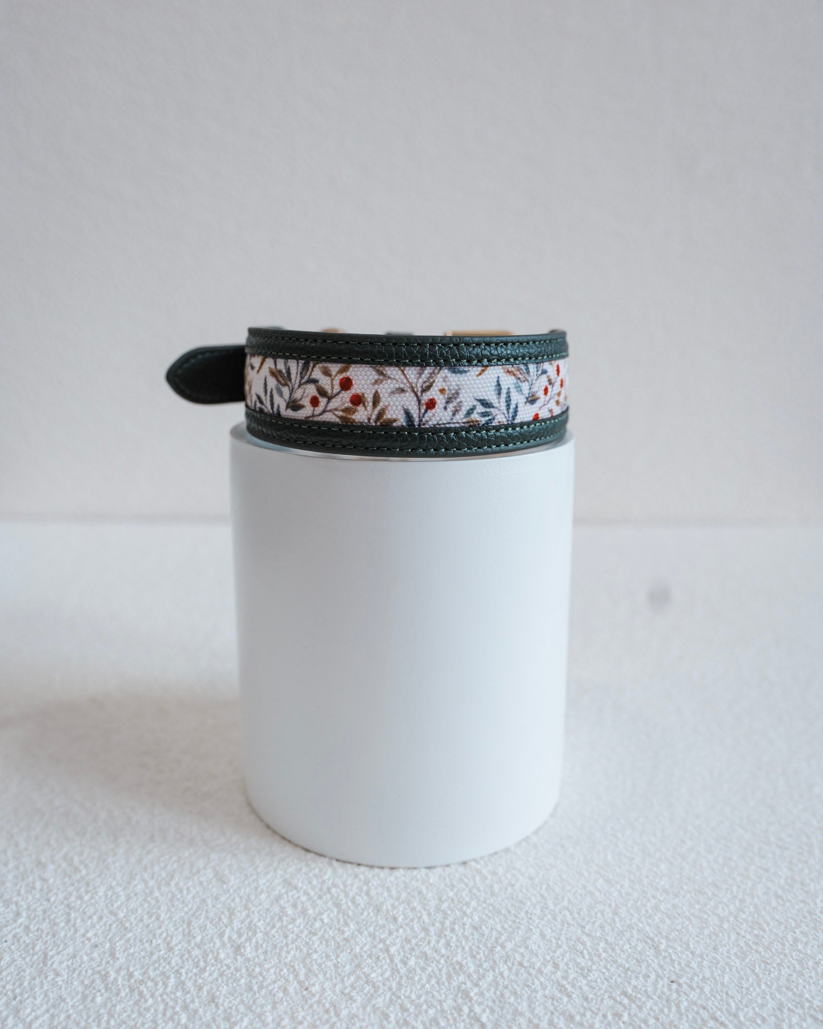 Crafted from abrasion-resistant vegan leather in a deep green base that complements the collection’s vintage-inspired prints, it offers a smooth, classic finish while preserving the clean silhouette the Nova is known for. Designed to balance structure with comfort, it rests naturally along your dog’s neckline without stiffness, ensuring effortless all-day wear.